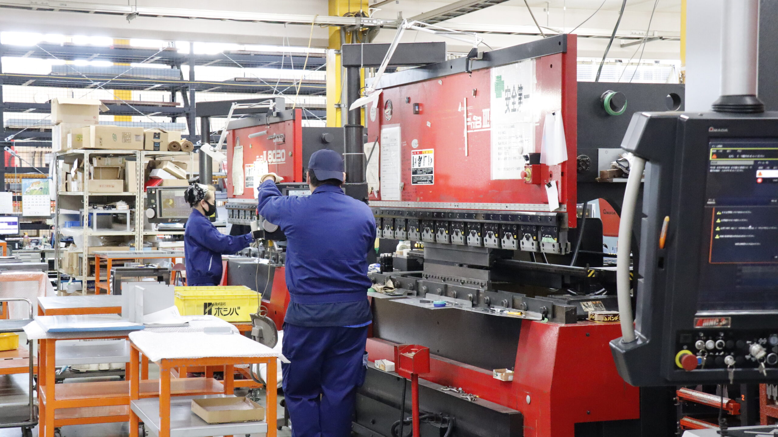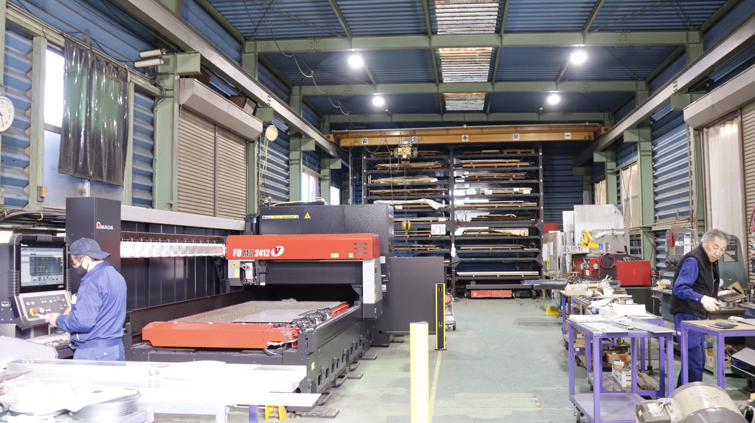 ②板金工程:NCマシンやレーザー加工機といった各種機械を使用して材料の切断や曲げ加工を行います。